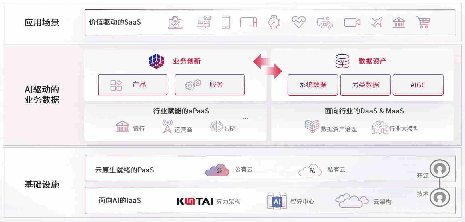 数字时代,,,围绕企业数字化转型的关键要素,,,AG尊龙凯时数码开创性的提出数云融合战略和技术体系框架,,,着力在云原生、、、数字原生、、、、AI原生和信创产业上架构产品和服务能力,,,为处在不同数字化转型阶段的快消零售、、、、汽车、、金融、、、医疗、、、政企、、教育、、、运营商等行业客户提供泛在的敏捷IT能力和融合的数据驱动能力,,,构建跨界融合创新的数字业务场景和新业务模式,,助力企业级客户建立面向未来的核心能力和竞争优势,,,,全面推动社会的数字化、、智能化转型升级。。。。