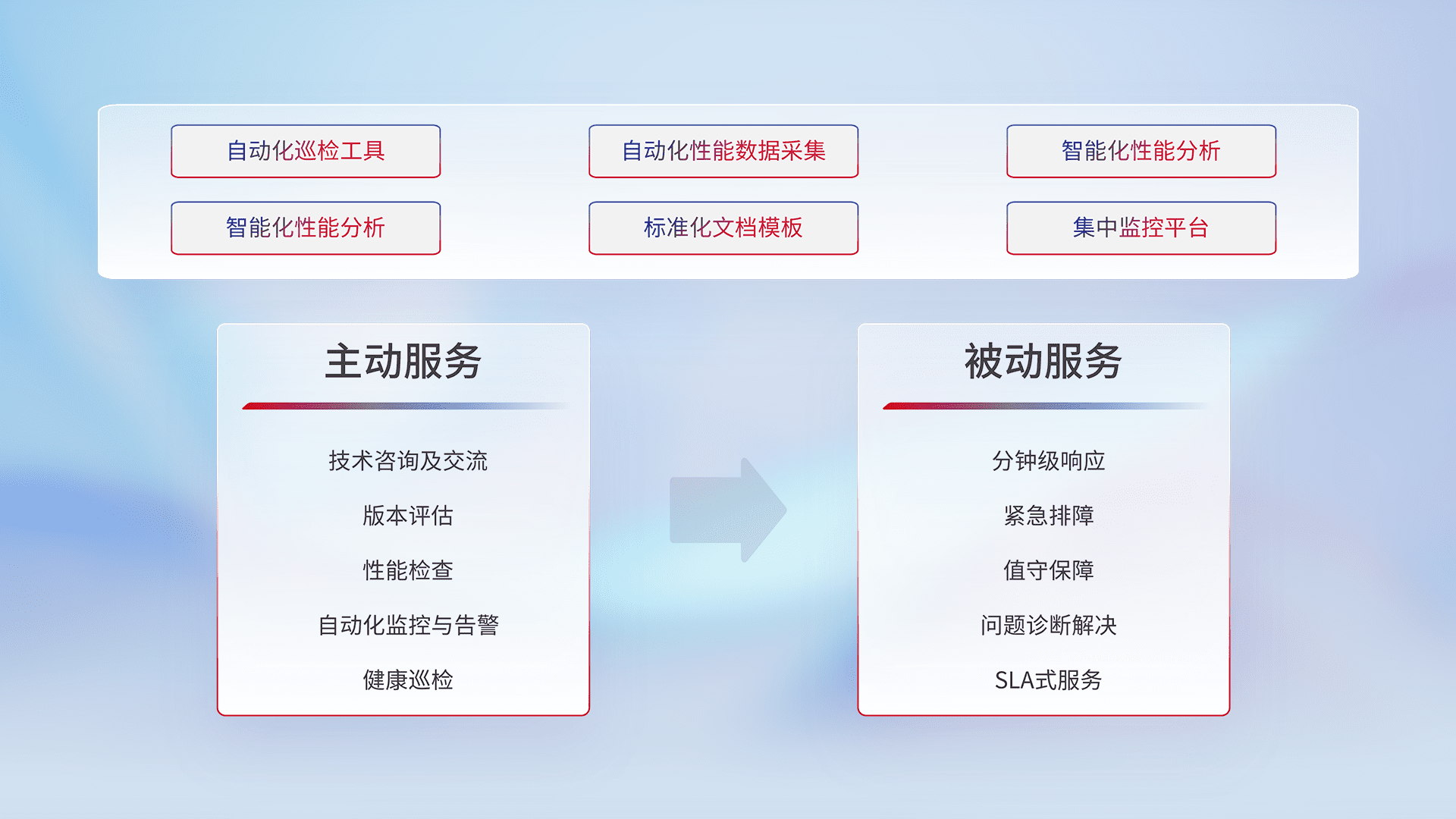 智能化工具和标准化文档,,,保障服务质量,,,提供主动服务(包含技术咨询、、、、版本评估、、、、性能检查、、自动化监控与告警、、健康巡检)和被动服务包含(分钟级响应、、、紧急排障、、、、值守保障、、问题诊断解决、、SLA服务)。。